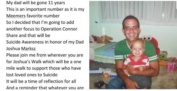 When Connor was 3 years old, he lost his Father to suicide on September 22, 2009. He has chosen to honor his fathers memory by Hosting an Annual Suicide awareness walk/5k during National suicide awareness month. Connor wants to remind people that "no matter what you are going through you do not have to walk alone!"