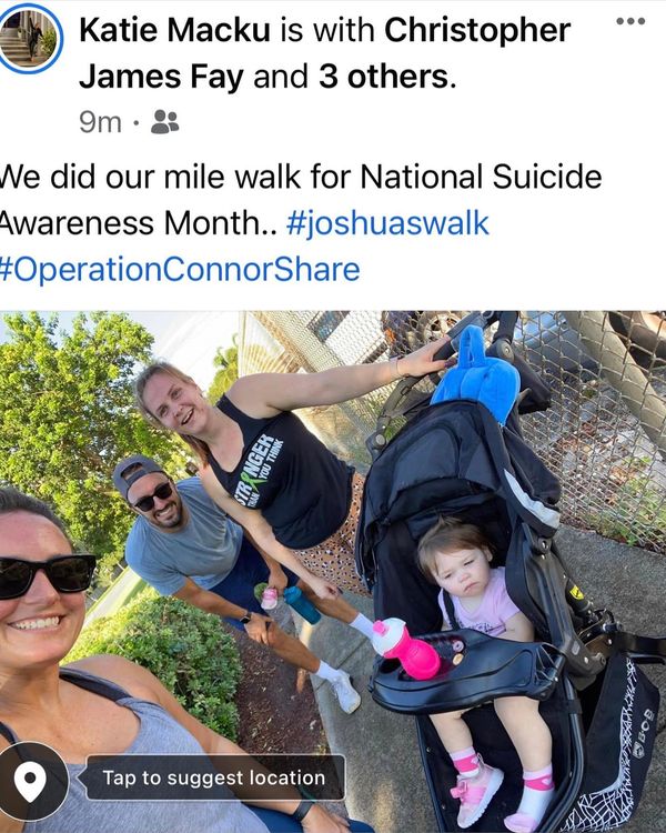 Join Connor from any state for a 1 mile virtual walk to spread suicide awareness every year on September 22. September is National Suicide Awareness and Prevention Month. Connor started this walk in honor of his father who died by suicide on September 22, 2009. Connor's mission is to spread awareness and his hope is that, whatever journey you are on, he hopes you know that you never have to walk alone.